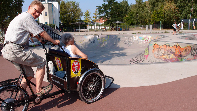 Von der Seite, von hinten, von vorne: Der Kameramann ist zufrieden mit seinem Filmmaterial. Eine Einstellung fehlt ihm aber noch: Die Rikscha-Räder, wie sie langsam am Objektiv der Kamera vorbeiziehen. Kein Problem. Schon kniet er mit seiner Kamera auf dem Boden und hält die Aufnahme fest. Im Park am Gleisdreieck angekommen, bestaunen Calle Overweg und Christel Strübing die wagemutigen Kunststücke der Skater auf der Halfpipe und drehen selbst eine Runde, um die Künstler auf zwei Rädern von allen Seiten zu bewundern.